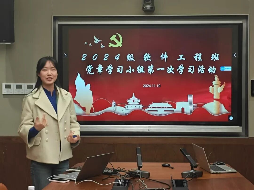 2024年11月19日,2024级软件工程班党章学习小组在逸夫楼108教室举行了首次集体学习活动。本次学习由软件工程班团总支部书记朱琪蔚主持,主题为“学党章精神,观进博风采——新时代党员的使命与担当”。
