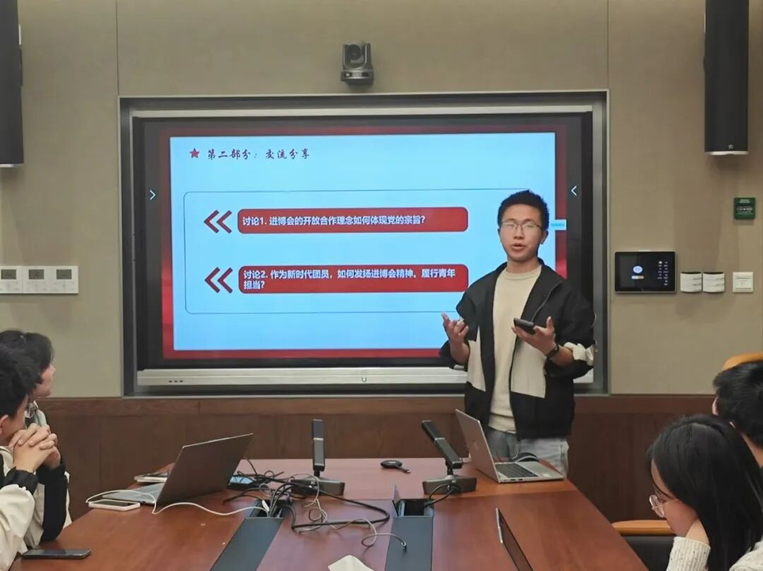 在第二项讨论中,同学们从多角度探讨了新时代青年团员如何以实际行动践行进博会精神。有同学认为,应当立足学习本领,不断提升专业能力,积极参与国际交流,以创新驱动助力社会发展;也有同学提到,应当主动关注国家发展动态,在日常生活中践行绿色环保、公益服务等理念,为构建人类命运共同体贡献青春力量。