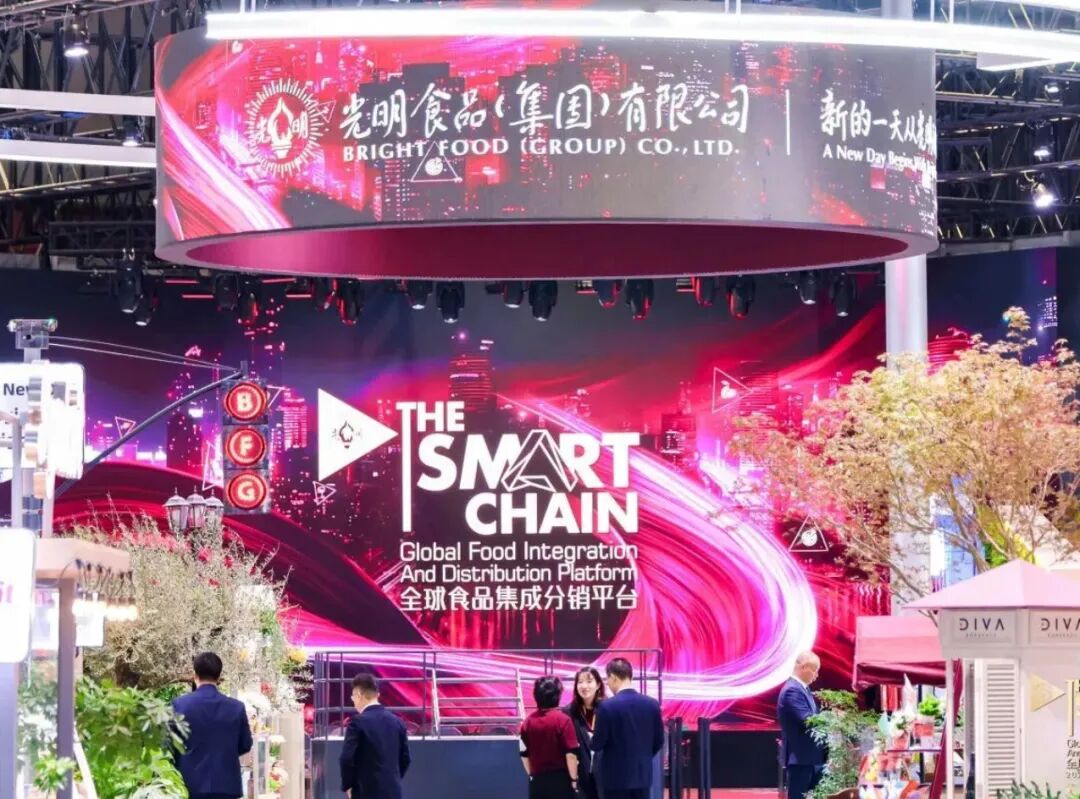 光明食品集团 本届进博展馆内最大单体展台,面积估计在3000-4000平米。通过旗下的“THE SMART CHAIN全球食品集成分销平台”整合了强大的全球化资源