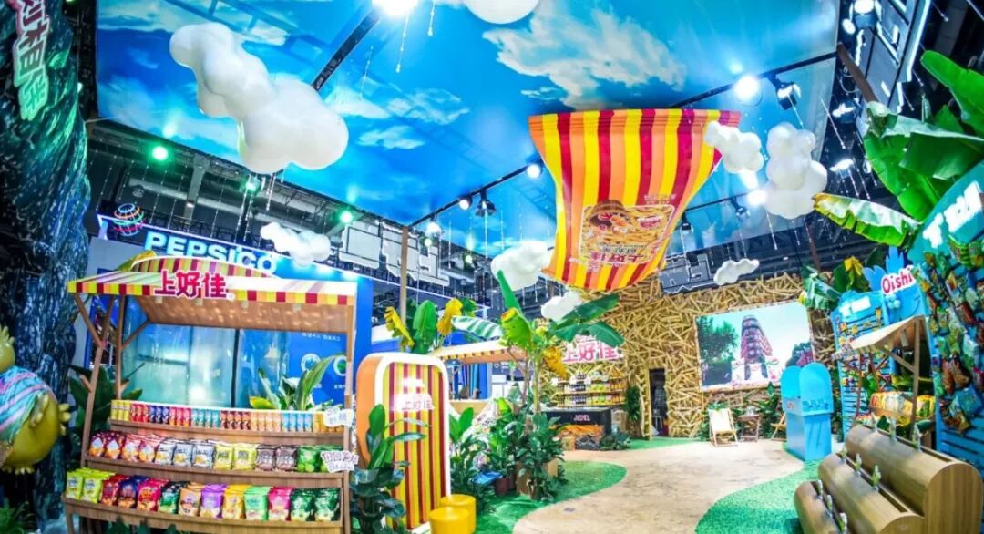 上好佳 作为连续七年参展进博会的品牌,今年的展台以:自然之选,佳味之源,后会有“七”为 主题,同时以太平洋海岛风情为灵感,搭设了一个热情款款的海岛趴区域