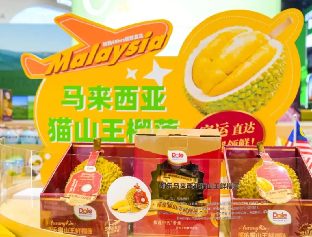 都乐 连续七年参展,“都乐阳光果蔬”展台的马来西亚猫山王鲜榴莲首次参展进博会,立即引发众多采购商及媒体关注。