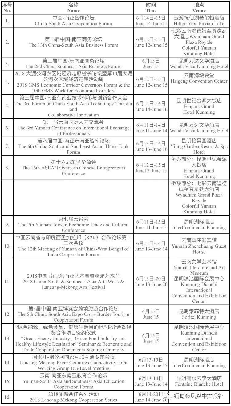 届时,中国-南亚商务论坛、中国-东南亚商务论坛、澜湄合作系列活动及大湄公河次区域(GMS)经济走廊活动周、中国-南亚东南亚智库论坛、东盟华商会、云台会等数十场会期活动将同期举办,为中国与南亚东南亚各国经贸合作相互投资提供平台,推动达成更多共识,凝聚更多发展合力。