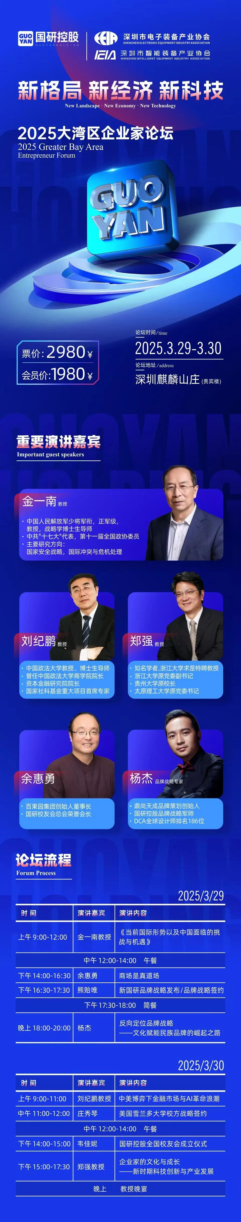 2025年大湾区企业家论坛以"新格局·新经济·新科技"为核心,集结顶级智库天团,打造全球企业家战略级对话平台,针对企业家关注的战略安全、政策合规、数字化转型三大痛点,分别匹配军事专家、政策学者、品牌操盘手等嘉宾的差异化内容,以品牌战略赋能制造业智能化跃迁,精准诠释了全球变革浪潮下的发展密码。现诚邀您参与这场破局未来的思想盛宴,为在新科技革命下企业如何突围解密!