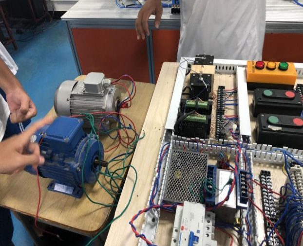 机电一体化专业的同学们在班主任和专业老师的带领下,依次参观了机电01实训室(数控加工、机械制造、机床线路)、机电02实训室(钳工、低压电工考证)、机电03实训室(交换机、网络综合布线、光纤)、机电04实训室(电子实训、电工基础) 基础电工实训室一楼(电工实训、照明线路、低压) 、基础电工实训室二楼(电拖2、照明线路、低压)、鼎利101实训室(大机房:电子CAD、PLC编程、网优)、鼎利102实训室(电子实训室、实训台、示波器、焊台)、鼎利103实训室(机器人实训,4台)、鼎利104(PLC实训台、伺服,PLC2)、鼎利105实训室(电拖1,前面:电拖,后面:机床排故)、鼎利106实训室(PLC实训台、变频器,PLC1) 。在各实训室老师认真讲解、操作演示,同学们听得很入神,恨不得马上投入到学习当中,亲自操作设备、配置数据、测试信号、制定方案。接着专业老师就同学们到校后对专业上的疑问进行了讲解,就机电一体化专业的发展方向进行了阐述,从“谁来教、在哪教”、“学什么、干什么”、“怎么干”等话题入手,介绍了机电一体化专业的师资、实训项目、所学课程、就业岗位等学生关心的话题,就机电一体化专业发展、专业基础理论、核心知识和技能等层面向同学们一一分析了当前机电行业的现状,进一步培养了同学们将专业知识与实践结合的意识。