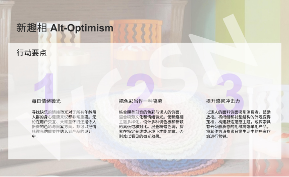 此外,根据三大趋势,报告也指出未来在各趋势下的行动要点。再创纪趋势聚焦于自然元素与可持续设计的和谐融合,强调了环保和健康的重要性,预示着家居设计将更加注重与自然的共生关系。新趣相趋势关注个性化和多元化的设计方向,激发了人们对美好生活的向往和创新思维的发挥。优化论趋势以简约智能的产品设计为主,突出了功能性和用户体验的优先性,通过运用科技使日常生活更加便捷和舒适。