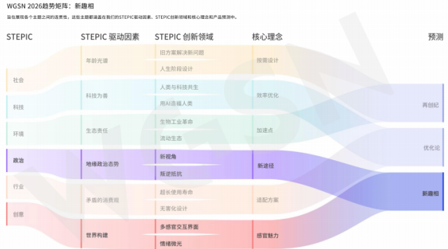 根据WGSN的STEPIC框架,从社会、科技、环境、政治、行业和创意六大维度出发,深入分析了影响未来家居生活趋势的宏观驱动因素和创新领域。这一分析为设计和产品开发提供了宏观视角,帮助决策者和创新者把握未来趋势,将这些因素融入设计之中,以创造更符合未来社会需求的产品和服务。(滑动查阅更多)
