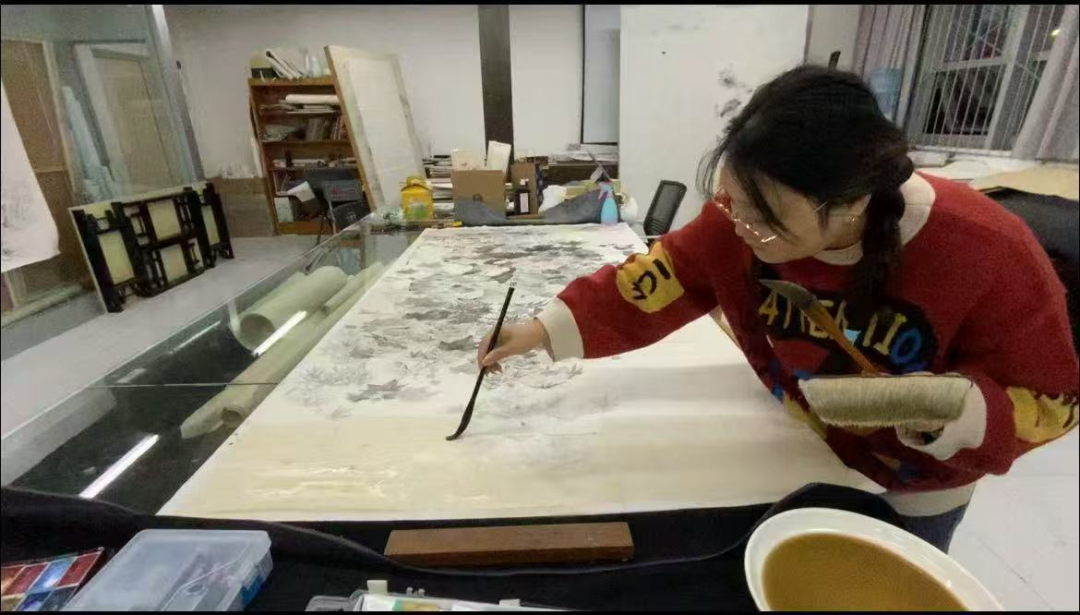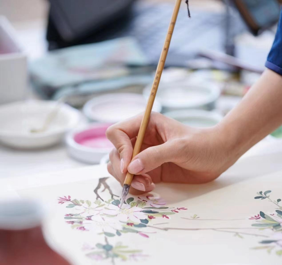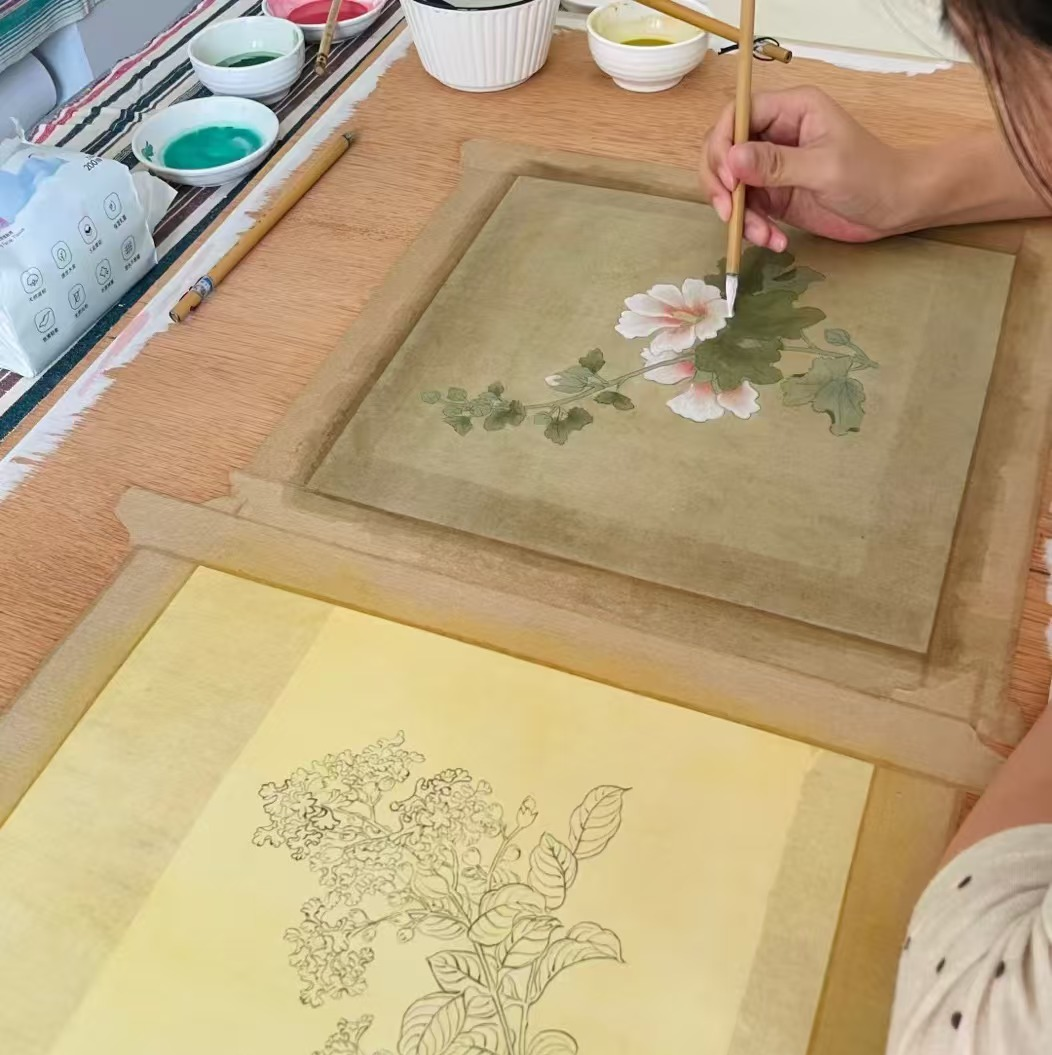 工笔画作为国画的基础和分类之一,其教学内容丰富多样,旨在帮助学生掌握工笔画的基本技法、构图原理、色彩运用以及创作能力。工笔画绘制中最重要的染色技巧,支笔蘸色,另一支笔蘸清水,将色彩拖染开去,形成色彩由浓到淡的渐变效果。