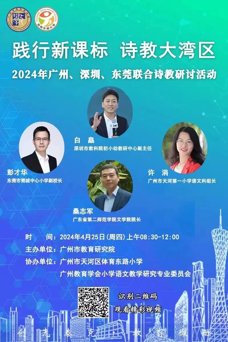 分享一篇原创的主持稿。尊敬的各位来宾,现场及线上的各位老师们:大家上午好!春风迎贵客,一到便繁华,万物在春日时节焕发新生,今天,我们怀揣着对古诗词教学的殷殷期待,相约在这里,开展“践行新课标 诗教大湾区”2024年广州、深圳、东莞联合语文诗教研讨活动。我是今天的主持人,来自荔湾区康有为纪念小学的曾睿老师。活动的顺利开展离不开辛勤付出的嘉宾老师们,下面,请允许我介绍本场活动的嘉宾老师,他们分别是:1广东第二师范学院文学院院长 桑志军 欢迎您!2 深圳市教育科学研究院初小幼教学研究中心副主任 白皛 欢迎您3东莞市莞城中小学校副校长 彭才华 欢迎您4广州市教育研究院教研员 孔祥明 欢迎您5广州市天河区体育东路小学 陈品花 欢迎您6广州市天河第一小学 许涓 欢迎您 同时,也感谢来自广州市小学语文中心组、各区小学语文中心组成员、市小语会花城诗会和线上收听的老师们,欢迎各位的到来!本次活动有2个环节:第一个环节是三位老师展示课例诗教课例,第二个环节是由6位老师带来的诗教沙龙。接下来,我们进入精彩课堂展示《忆江南》,执教的是彭才华老师,念简介(彭才华:正高级教师,广东省东莞市莞城中心小学副校长,广东省“五一”劳动奖章获得者,广东省名师工作室主持人,全国“十大青年名师”, “广东省小学语文名师”,华南师范大学兼职教授,广东省首届教学能力大赛小学教育组总冠军。获省级教学成果一等奖两次,出版专著三部。)和他合作的是三年1班班的孩子们,让我们把时间和舞台交给他和可爱的孩子们。掌声有请彭老师和可爱的孩子们!彭老师执教的《忆江南》,让人情不自禁想念起江南的美好,感谢彭老师的精彩呈现,诗意的课堂,值得我们细细品味。通过彭老师的这节课,我学到了很多。让我们继续以教学研讨为载体,汲人之长,补自己之短。接下来,请允许我介绍一下第二节课的授课名师(许涓老师,南粤优秀教师,广州市天河第一小学语文教师,省青研中心副主任,市小语会理事,市小语骨干教师导师。曾在全国小学青年教师语文教学观摩活动中做现场课展示,参加省小语青年教师教学大赛、省教学能力大赛和省小语教师素养大赛均获最高奖。主持或参与各级课题10余项,获市结题成果一等奖,参与编撰书籍5本,有论文被人大复印资料全文转载。)欢迎许涓老师带来的诗教课例《从军行》组诗,和她合作的是五3班的孩子们!家国情怀,在诗人笔下,更在许老师的课堂中静静流淌。接下来让我们继续沉浸在美好的诗意之中!请允许我为大家介绍第三节课为我们授课的名师,白皛,现任深圳市教育科学研究院初小幼教学研究中心副主任、小学语文教研员,广东省小语会常务理事,深圳市教育学会理事,人民教育出版社统编教材培训专家,中华诗词学会诗教委员会副秘书长,广东省校园阅读推广人,首都师范大学国学教育学院特聘专家,教育部迦陵杯诗词讲解大赛评委。接下来,让我们有请白皛(xiao)老师带来《十五夜望月》,和他合作的是六4班的孩子们!感谢白老师的精彩课堂,让我感觉月亮仿佛也有了生命,有了温情。多美的感觉!感谢各位老师和同学们的精彩展示。诗词的魅力在于它能够触动人心。接下来,让我们继续以教学研讨为载体,让我们以热烈的掌声有请六位嘉宾老师带来诗教沙龙(有请桑院 孔校 陈校 以及三位执教老师),有请陈校长为我们主持。走得最快的总是最美的时光,当讲座已经悄然降落,智慧之音还在我们耳边回荡,思想的火花仿佛还跳跃在我们眼前,感谢专家们为诗教指引方向。同时,也要感谢广州、深圳、东莞三地教育局和学校的大力支持和配合,让我们的活动能够圆满成功。最后,让我们再次以热烈的掌声,为这次“践行新课标 诗教大湾区”2024年广州、深圳、东莞联合语文诗教研讨活动画上圆满的句号。现在,我宣布,今天的教研活动到此结束!感谢大家的陪伴与参与!谢谢大家!期待我们下次再见!感谢大家的陪伴与参与!请各位专家老师、市小语会花城诗会的老师们移步台前合影留念。