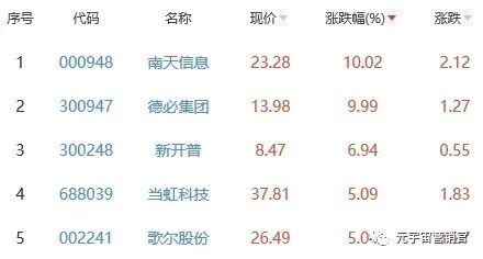其中,南天信息、德必集团、新开普、当虹科技、歌尔股份位列板块涨幅前五位,涨幅分别为10.02%、9.99%、6.94%、5.09%、5.04%。中国移动、棕榈股份、华扬联众、数源科技、网宿科技、奥拓电子位列涨幅榜后五位,涨幅分别为-2.44%、-0.99%、-0.78%、-0.60%、-0.20%、-0.20%。