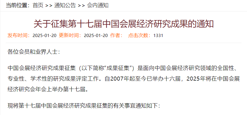 第十七届中国会展经济研究成果征集启动,中国会展经济研究成果征集(简称“成果征集”)是面向中国会展经济研究领域的全国性、专业性、学术性的研究成果评定工作。自2007年起至今已举办十六届,2025年将在中国会展经济研究会年会上举办第十七届。(来源:会展经济PLUS)