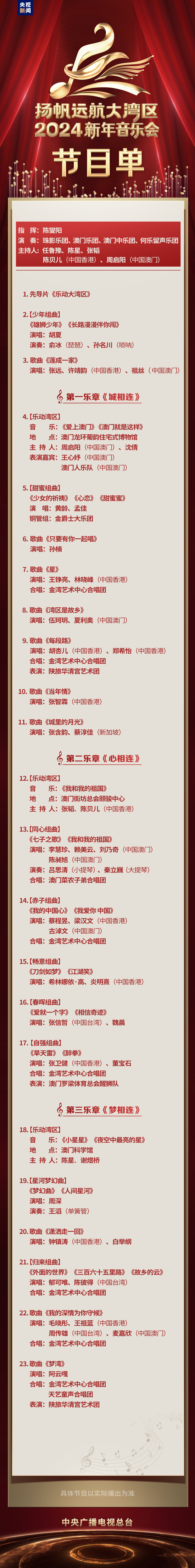 中央广播电视总台《扬帆远航大湾区——2024新年音乐会》节目单发布