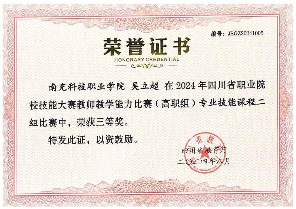 吴立超,中共党员,副教授,智能制造学院副院长(主持工作)、专业群负责人,技能大师工作室领办人,高级“双师型”教师,汽车维修高级技师,国家级技能大赛裁判员,四川省第三批职业院校紧缺领域教师技艺技能传承创新平台成员,四川省汽车领域1+X职业技能等级证书培训师、考评员,四川省职业技能鉴定考评员。先后获四川省职业院校教师教学能力大赛三等奖、四川省职业院校技能大赛“优秀指导教师”、绵阳市优秀教师、教学名师等多项荣誉,指导学生参加省级及以上职业技能大赛获三等奖以上荣誉8项,主持、参与各级科研、教改项目10余项,发表论文6篇,主编教材2部。