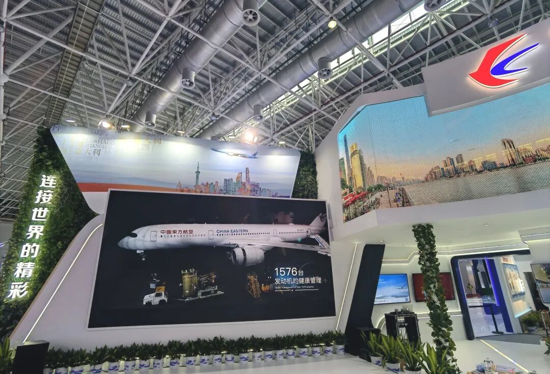 本届航展,东航展位设置于航空航天馆内,在150余平米的展位上,东航以白色为主基调,以总高度6米的双层结构进行搭建,借助展板和电子显示屏,将展台自然分割成企业形象宣传区、科技展示区、绿色概念区等特色展示区域。东航B777进博号彩绘机机模居中摆放,将创新、协调、绿色、开放、共享的新发展理念融入展位布局,以此欢迎远道而来的每一位观众。