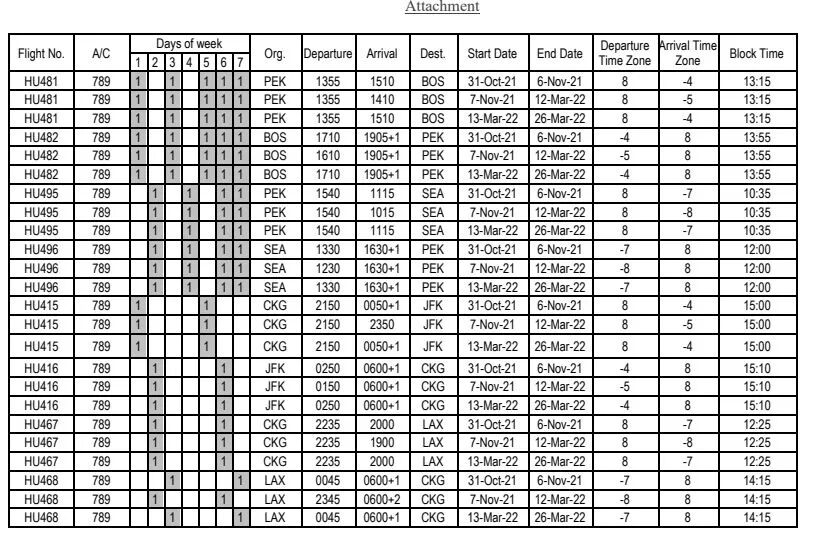 美交通部文件显示,海南航空提交了冬季(10月31日-22年3月26日)航班计划: