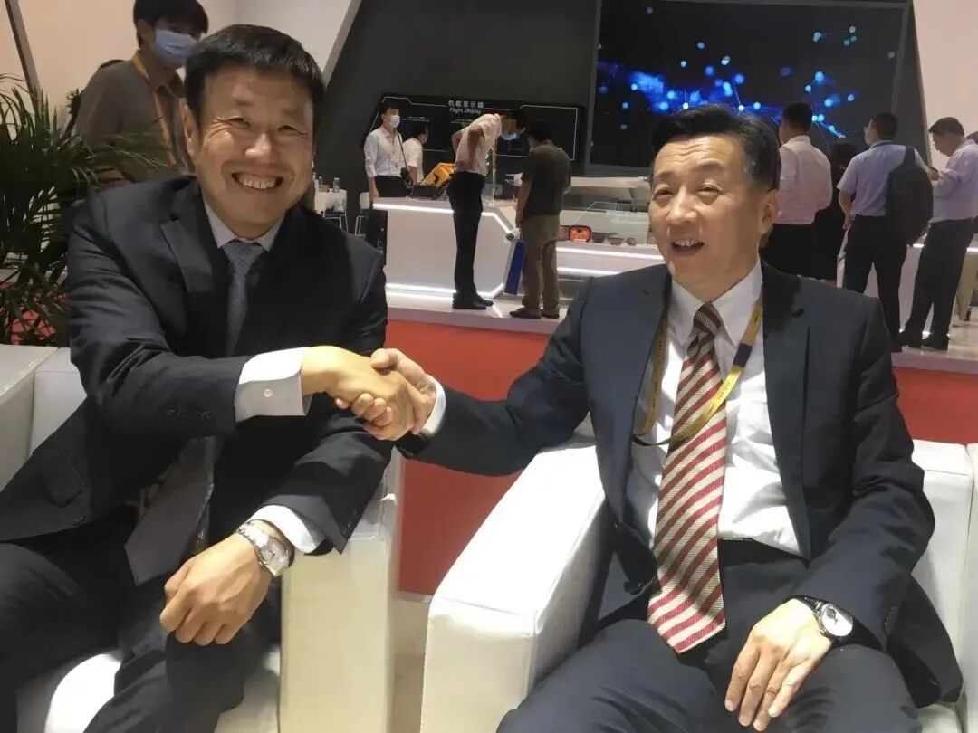 Ameco首席市场官朱晓(右)、柯林斯宇航客户业务总监薛军(左)在航展现场就双方合作接受媒体采访