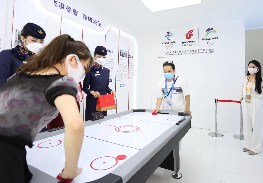 国航作为2022年北京冬奥会和冬残奥会官方航空客运合作伙伴,本届航展特别设立了冬奥展示专区,专区设置了桌上冰球游戏等互动体验项目,在演绎冬季运动项目激情与魅力的同时,参观者可以现场展开较量,近距离接触冰雪运动,了解冬奥文化。