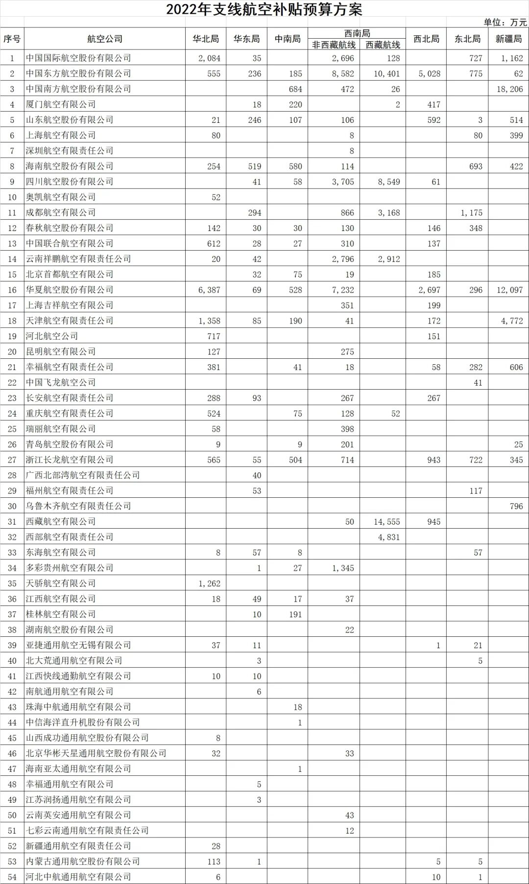 9月28日中国民航局发布了2022年民航支线航空补贴预算方案,54家企业累计获得15.38亿元。根据《支线航空补贴管理暂行办法》(民航发〔2013〕28号)民航发展基金使用管理有关规定,以2020年下半年至2021年上半年民航运输生产统计数据为依据,民航局提出2022年民航支线航空补贴方案,现予公示。公示期自2021年9月28至10月7日。