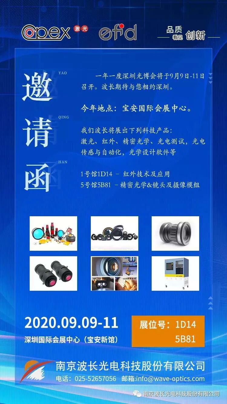南京波长光电科技股份有限公司主要从事激光光学产品、红外镜片镜头、光电检测系统以及光机电软方案的研发、生产和销售。本次展会的展位号是1D14与5B81。欢迎各位朋友到展位参观与指导!点此查看详情
