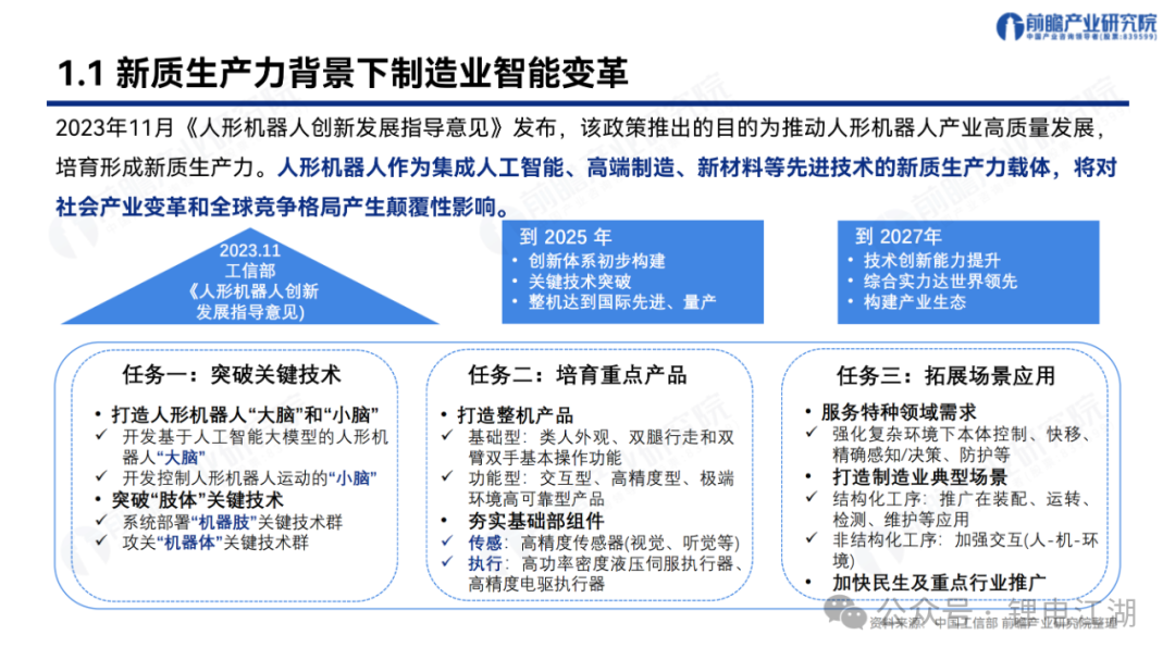 2023年11月《人形机器人创新发展指导意见》发布,该政策推出的目的为推动人形机器人产业高质量发展,培育形成新质生产力。人形机器人作为集成人工智能、高端制造、新材料等先进技术的新质生产力载体,将对社会产业变革和全球竞争格局产生颠覆性影响。