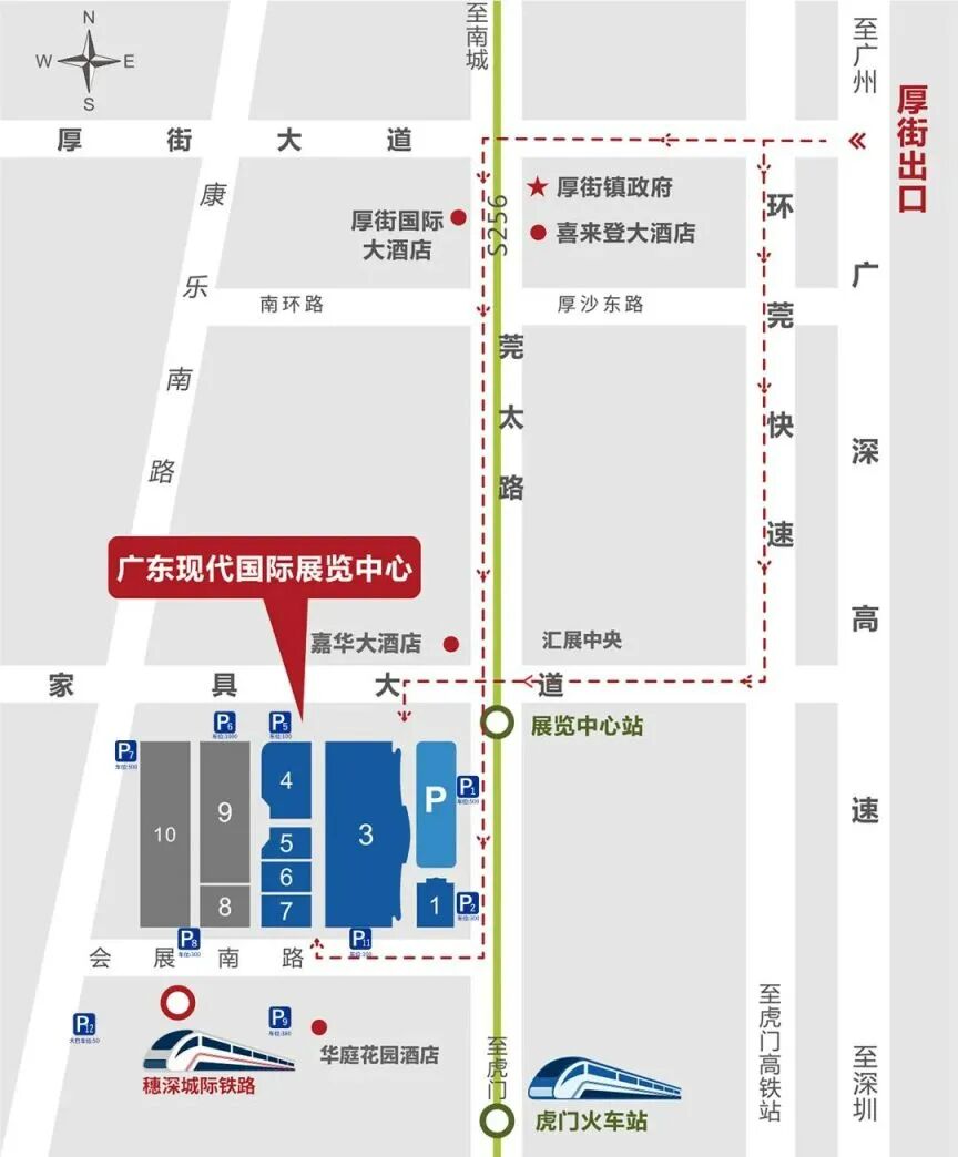 After arriving at Humen Railway Station or Dongguan Railway Station, you can directly take Line 2, get off at "Exhibition Center" station, and exit from Exit B1.乘坐穗深城际铁路到达“厚街站”,步行约600米(10分钟)即可到达展馆。