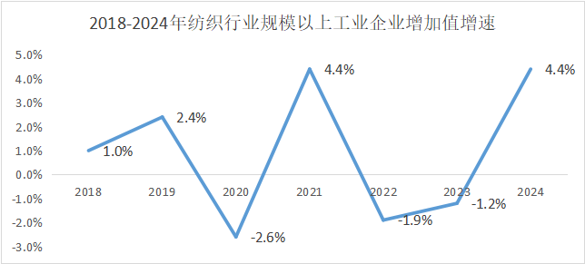 近年,中国纺织行业规模以上工业企业增加值波动比较大,2024年纺织行业规模以上企业增加值增速达到4.4%,增速较2023年有较大提升。