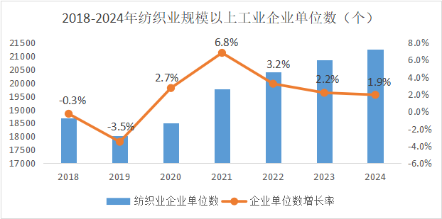 近年,中国纺织行业的企业数量呈现稳步增长趋势。2024年中国纺织企业单位数为21263个,比2023年增长了1.9%。