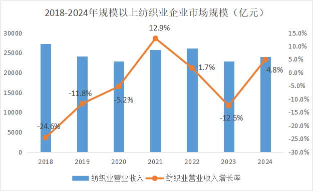 从纺织行业规模看,中国规模以上纺织业企业营业收入呈波动趋势。2024年,规模以上纺织业企业营业收入为23988亿元,同比增加4.8%。