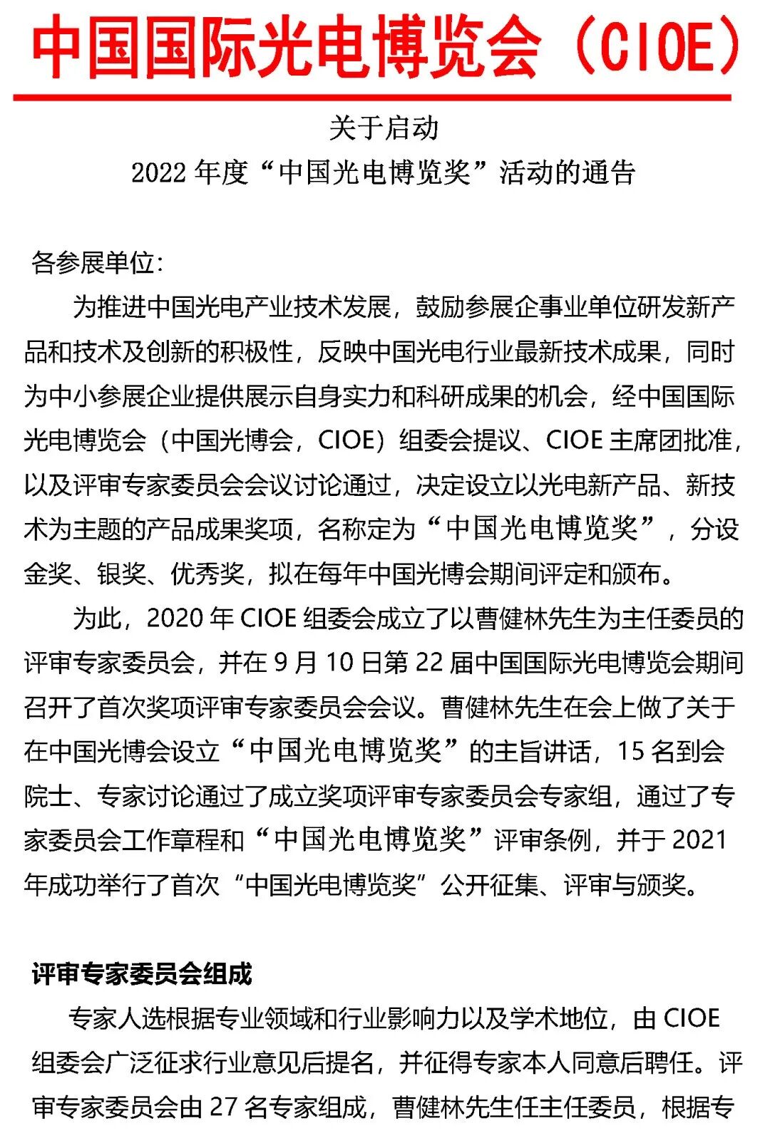 CIOE自去年首次推出“中国光电博览奖”征集评选以来,得到了业界特别是参展企业的高度关注和积极参与。企事业单位提交专业有效参评项目百余项,经过专家团三轮评审及现场终审,共计34个申报项目最后入围并获奖,向业界展示了强大的中国光电科技创新力量 。沧海横流方显英雄本色,疫情肆虐下光电行业更呼唤创新科技带来新的曙光。CIOE中国光博会组委会即日起启动2022年度 “中国光电博览奖”评选项目征集,欢迎所有参展企事业单位积极申报展示具有代表性、创新性的研发项目,同台竞技切磋光电科研潮流,高手对决引领创新科技风向。***2022年度“中国光电博览奖”即日起开始项目征集,截止时间为2022年6月15日。***