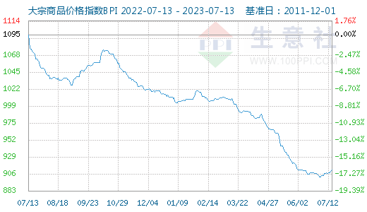 7月13日大宗商品价格指数BPI为913点,较前一日上涨了2点,较周期内最高点1343点(2021-10-19)下降了32.02%,较2016年02月03日最低点660点上涨了38.33%。(注:周期是2011-12-01至今)