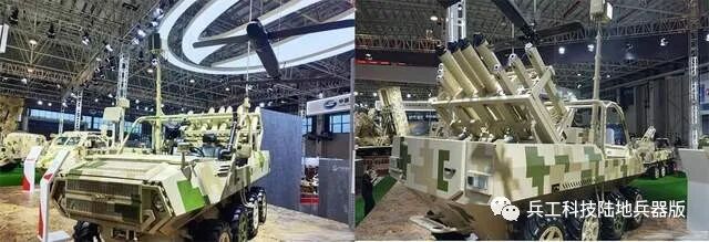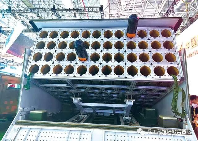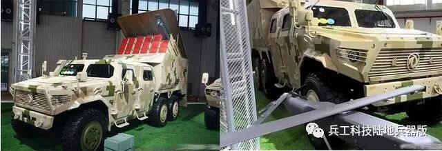 由航天科工集团研发的全地形箱式发射蜂群作战系统采用山猫CS/VP17高机动底盘。这款车辆采用V型车身焊接和增程式油电混合驱动,安装了双A型摆臂组成的独立悬架,大幅提升了车辆的舒适性和通过性。底盘后部将车厢更换为钢架,并安装了镂空式钢架发射装置,由液压控制发射方向和角度,可以安装两种不同的巡飞弹。其中,大型的巡飞弹采用圆柱型弹体设计,弹体头部安装高分辨率EO/IR光电转塔,飞行速度180千米/小时,作战半径40公里,续航时间20~40分钟,战斗部与反坦克导弹类似,因此可打击坦克和重型装甲车辆。另一种方形弹体的巡飞弹则比较短,主要反软目标,光电头也采用固定设计。按照其发射架构型来看,该系统可携带两个装9发短弹的模块和两个装4发长弹的模块,备弹一共26发,具备较好的软/硬目标反制及快速突防能力。