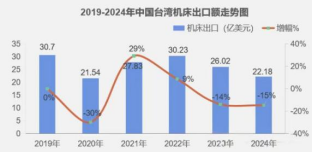 2024年台湾机床出口额22.18亿美元,同比下降14.8%,进口额5.57亿美元,下降5.7%。金切机床和成形机床出口额分别下降16.8%和3.7%。最大出口市场为中国大陆,占比28%,美国和土耳其次之。进口主要来自日本。