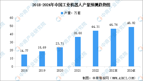 近年来,在国内密集出台的政策和不断成熟的市场等多重因素的驱动下,我国工业机器人产量总体保持稳定增长态势。中商产业研究院发布的《2023-2028年中国工业机器人行业深度调查及投融资战略研究报告》显示,2022年全国规模以上工业企业的工业机器人累计完成产量44.31万套,近五年年均复合增长率为31.61%。中商产业研究院分析师预测,2024年中国工业机器人产量将达到48.92万套。