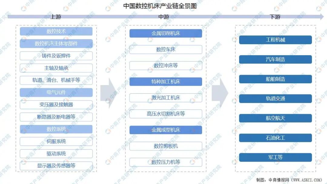 数控机床的产业链上游主要分为数控技术、数控机床主体零部件、电气元件和数控系统四大部分;中游为数控机床的种类,主要包括金属切削床、特种加工机床及金属成型机床;下游为数控机床的应用领域,主要用于工程机械、汽车制造、船舶制造、轨道交通、航天航空、石油化工等。