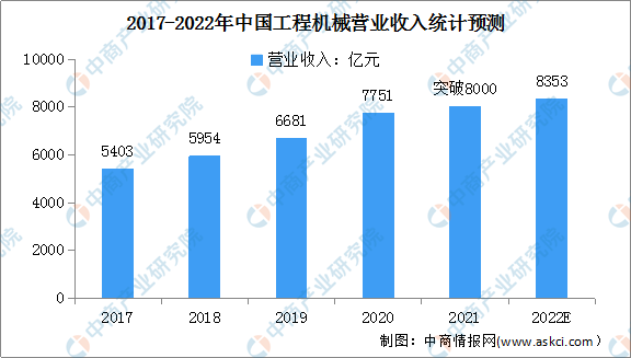 近年来,中国工程机械行业营业收入稳步增长。2017年我国工程机械行业营业收入突破5000亿元,2018年逼近6000亿元,2020年突破7000亿元,2021年工程机械行业营业收入首次突破8000亿元。预计2022年我国工程机械行业营业收入将进一步达到8353亿元。