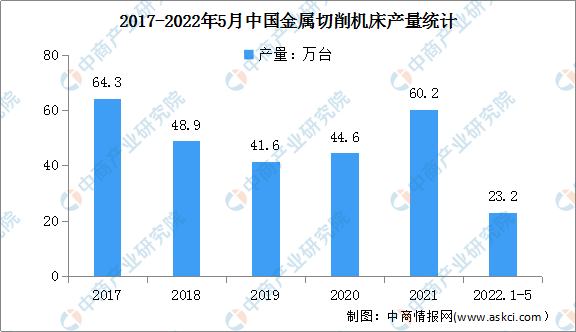 金属切削机床是用切削的方法将金属毛坯加工成机器零件的机器。数据显示,2020年我国金属切削床产量达44.6万台,同比增长5.9%。2021年我国金属切削床产量60.2万台,同比增长29.2%。最新数据显示,2022年1-5月,我国金属切削床产量达23.2万台,同比下降8.7%。