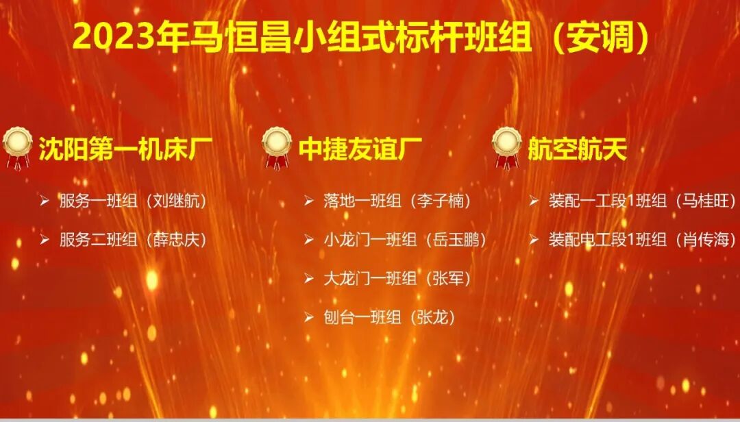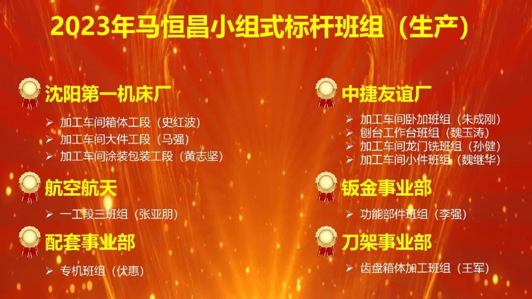 其中生产类班组11个,分别是沈阳第一机床厂加工车间箱体工段、大件工段、涂装包装工段;中捷友谊厂加工车间卧加班组、刨台工作台班组、龙门铣班组、小件班组;航空航天一工段三班组;钣金事业部功能部件班组;配套事业部专机班组;刀架事业部齿盘箱体加工班组。