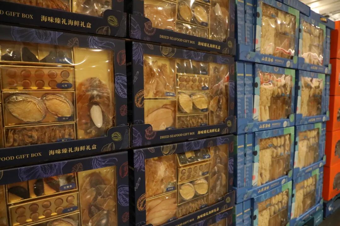 正值农历春节前,门店还专门规划了“年货区域”,广州酒家榴莲花胶鸡煲、新宝堂25年新会陈皮、海味臻礼礼盒、东北开口松子等均是主打产品。