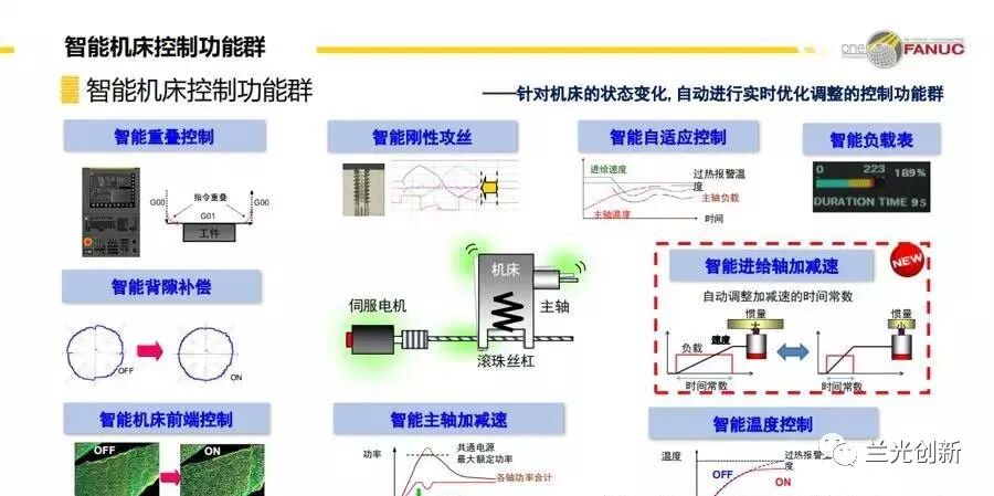FANUC系统以提高机床控制智能化为方向,在其新系统0iMF上标配了智能化功能群,包括:智能重叠控制、智能进给轴加减速、智能主轴加减速、智能自适应控制、智能反向间隙补偿、智能机床前端点控制、智能刚性攻丝。
