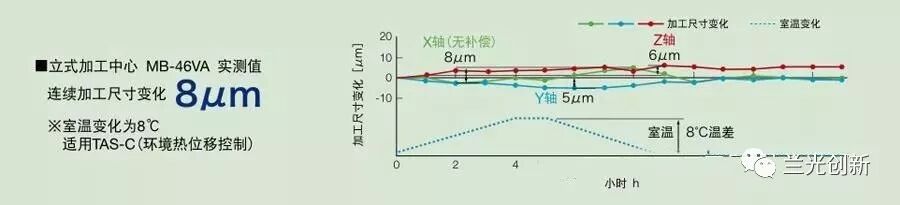 (5)准确控制规则的热位移,即“热亲和”功能:机床周围的温度变化及加工过程中产生的热量,都会对加工精度产生很大的影响。OKUMA设计了接受温度变化,同时擅于控制热位移的机床结构。只需在安装机床时确认一次尺寸,可大幅减少之后的补偿次数。