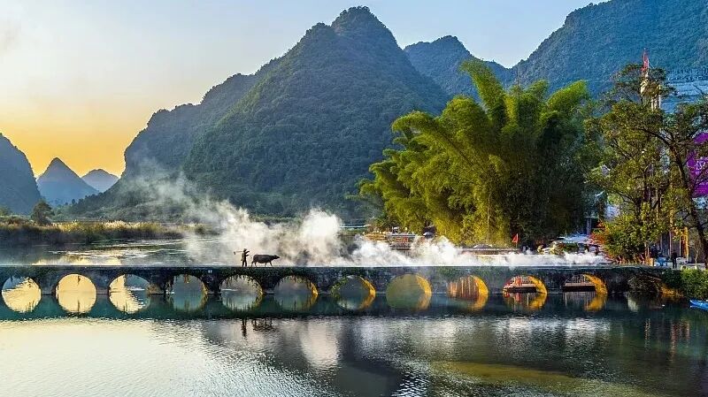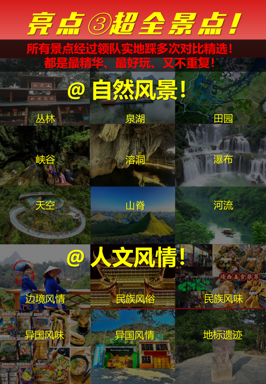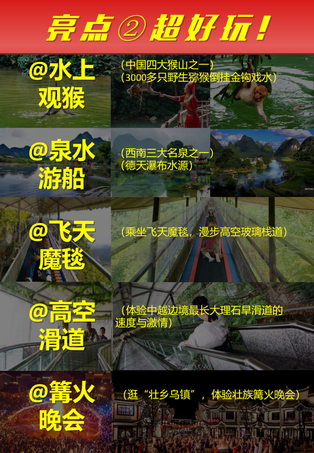 (参考票价,以实际为准:1.龙虎山门票加竹筏70;2.鹅泉团队票20;3.古龙山门票加接驳车70;4.德天瀑布门票加接驳车110;合计约:270元/人。