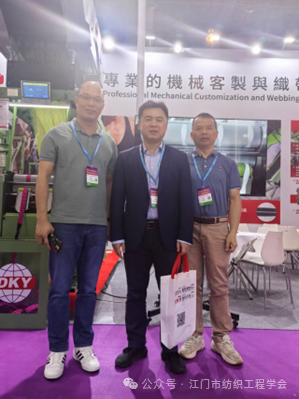 3月25日,江门市纺织工程学会理事长于晖教授及学会理事单位开平启帆织造有限公司总经理黄列旗等一同参观展会,调研制衣制鞋行业的技术发展、市场需求。