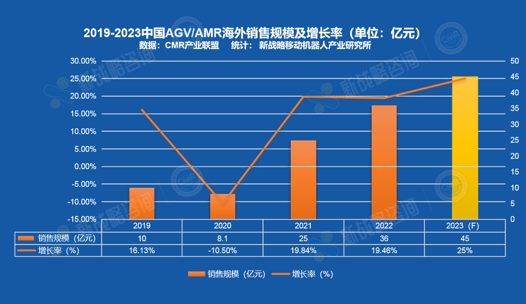根据新战略移动机器人产业研究所初步统计,2023年,中国AGV/AMR出口规模预计在45亿左右。
