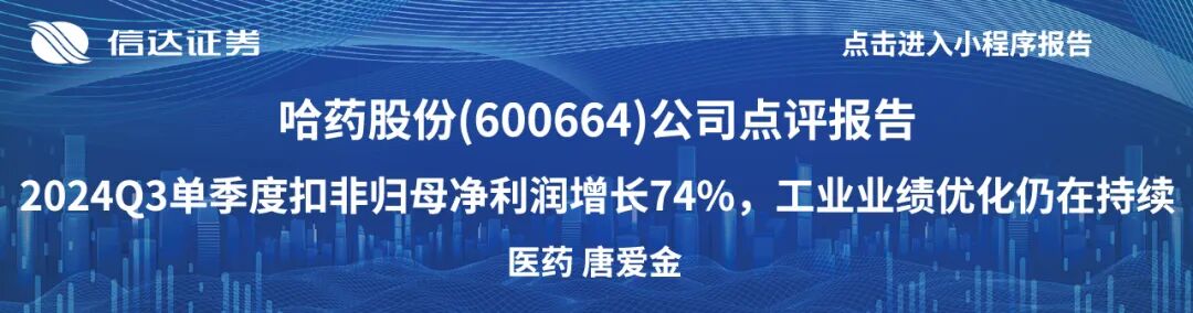 哈药股份(600664)公司点评报告:2024Q3单季度扣非归母净利润增长74%,工业业绩优化仍在持续