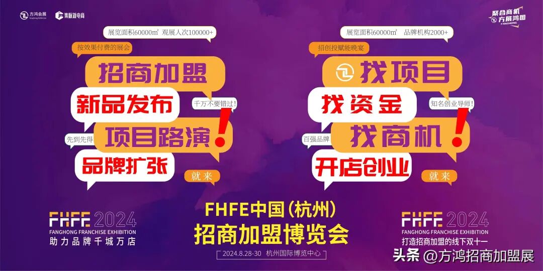 公司定期举办“按效果付费”的FHFE中国连锁联营招商加盟博览会,简称“杭州连锁加盟展”。平台通过收集和展示各种招商加盟项目,帮助投资者找到合适的创业机会,同时也帮助招商者扩大品牌影响力,吸引更多的加盟商和投资创业者。