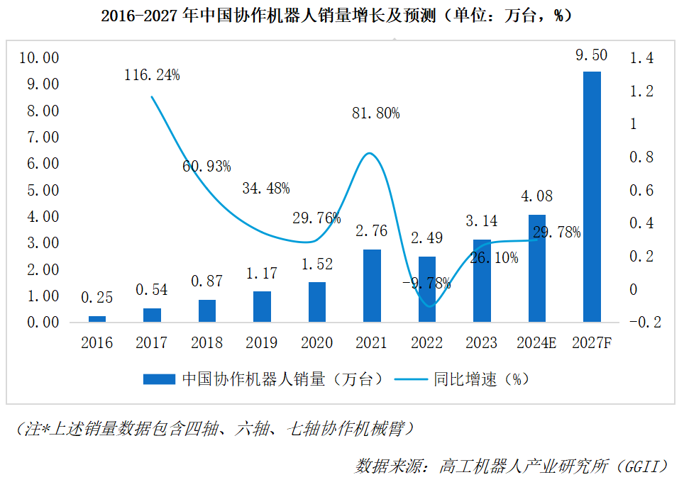 GGII预计,2024年中国协作机器人销量将达到4.08万台,同比增长29.78%。未来,随着3C复苏预期的不断强化,中国协作机器人行业将保持高速增长。预计至2027年,中国协作机器人销量将接近9.5万台,市场规模将接近60亿元。