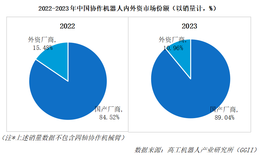 GGII数据显示,国产厂商六轴及以上协作机器人本体销量市场份额由2022年的84.52%上升至2023年的89.04%,较上一年同比上升4.52个百分点。