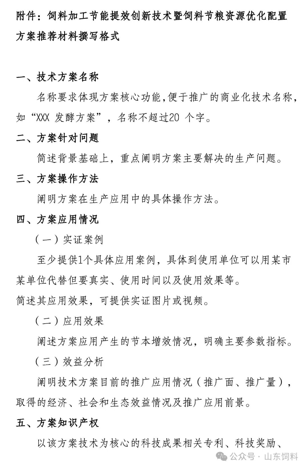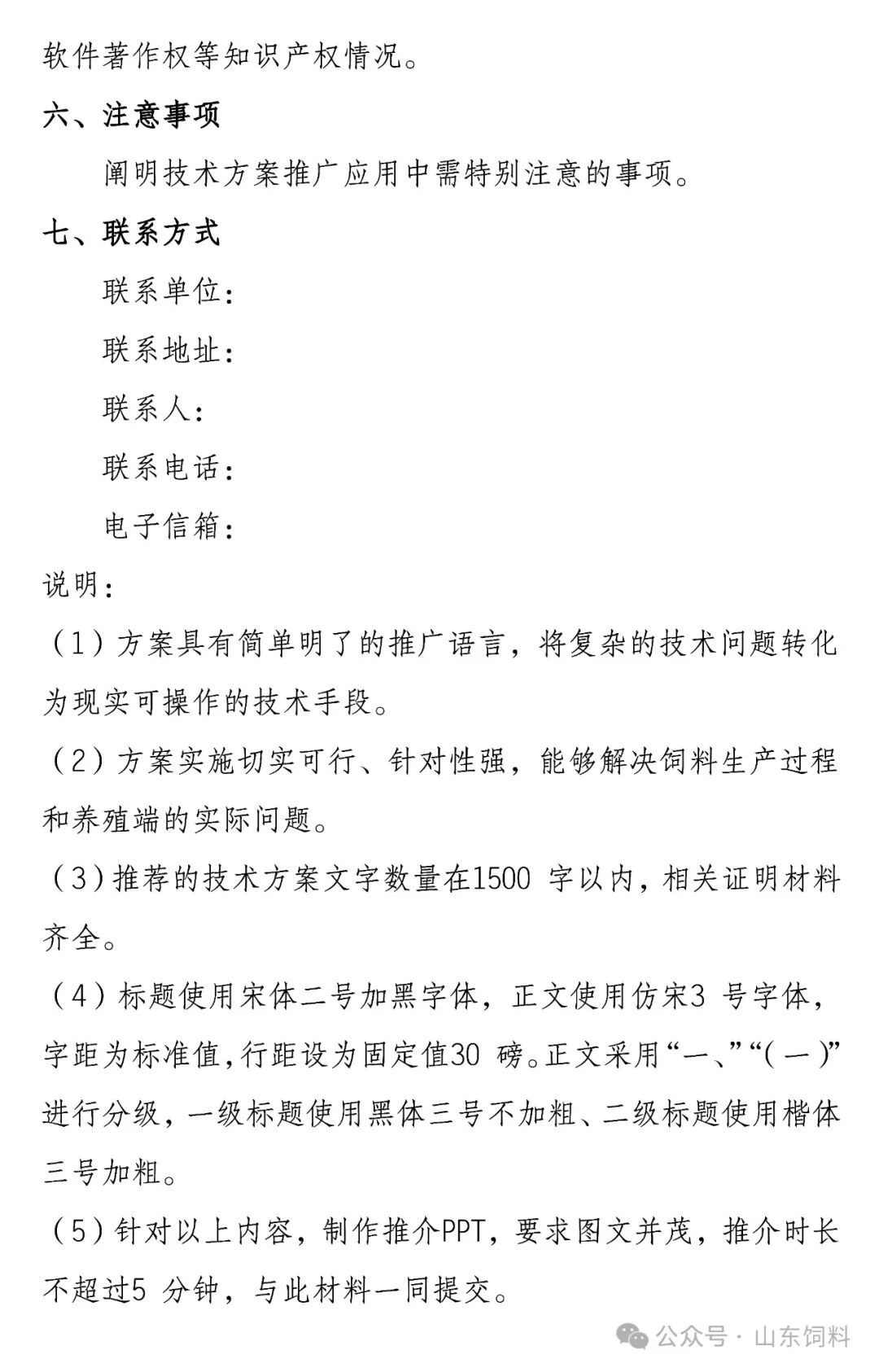 “名称简单”(通俗易懂)“针对问题” “实施方法”“实证案例”“效益分析”等内容。方案中涉及的技术和产品,确保合法合规。对参赛材料的规范性,所涉及技术和产品的科学性、合法合规性进行形式审查初选。初选通过的方案,以统一格式在网络平台展示,开展网络投票,以宣传推介本活动及方案。2025年4月18日全国饲料博览会现场设置网投优选方案提供方代表组团参会,通过PPT现场讲解(5 分钟)、专家和用户代表提问并进行打分(1分钟),综合决赛出最终一、二、三等奖。相关优秀创新技术方案将连续3个月在《山东饲料》杂志、公众号等自媒体推广。于参赛截止日期前提交《饲料加工节能提效创新技术暨饲料节粮资源优化配置方案推荐材料》(附件),推介演示PPT资料及相关专利、获奖证书等证明支撑材料。