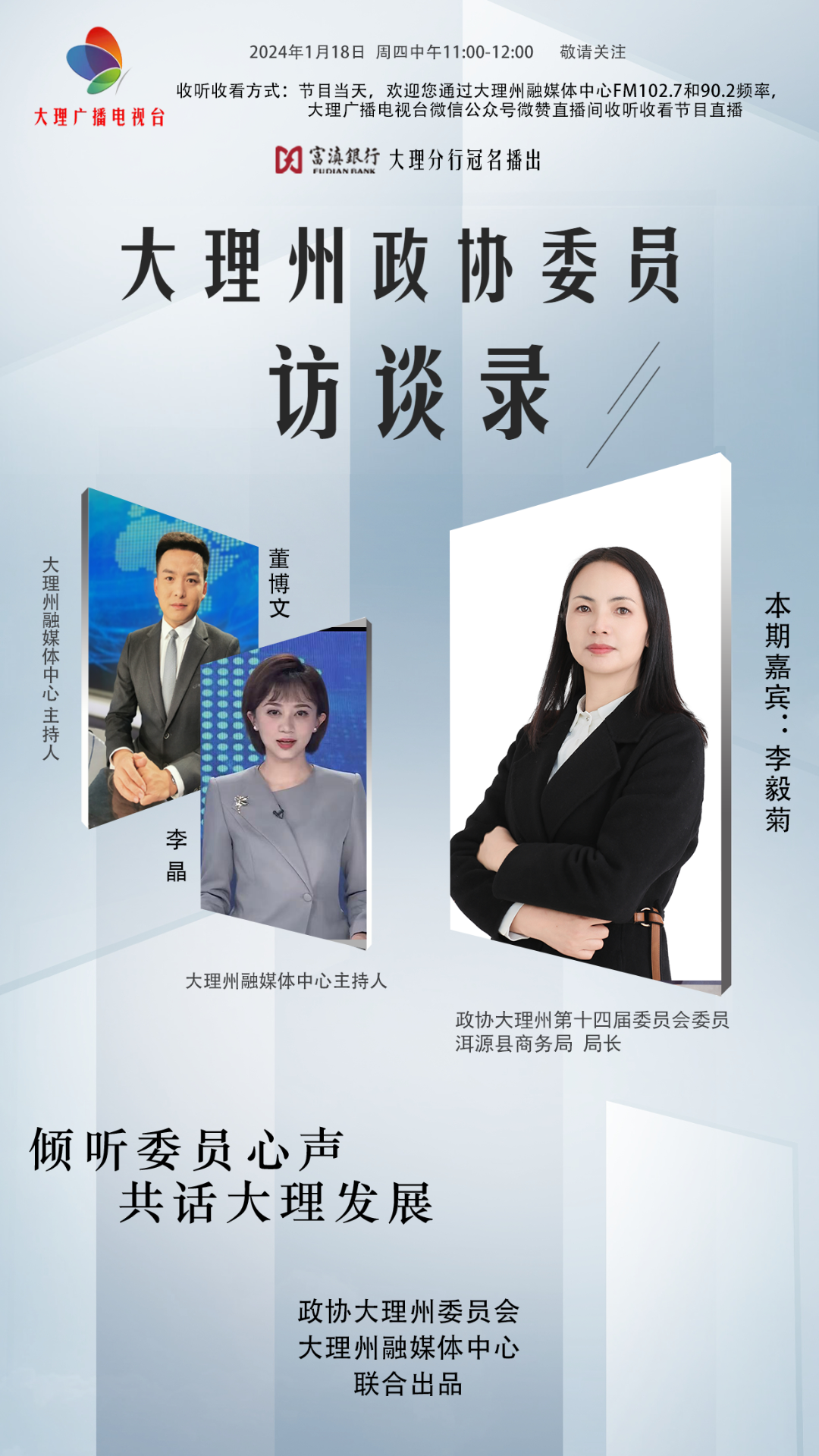 今天上午11:00—12:00,第075期《大理州政协委员访谈录》邀请:政协大理州第十四届委员会委员,洱源县商务局局长李毅菊,就洱源县紧扣绿色发展主题,从推进绿色流通和绿色消费、绿色贸易和投资入手,打造绿色食品牌等方面的话题进行交流探讨。