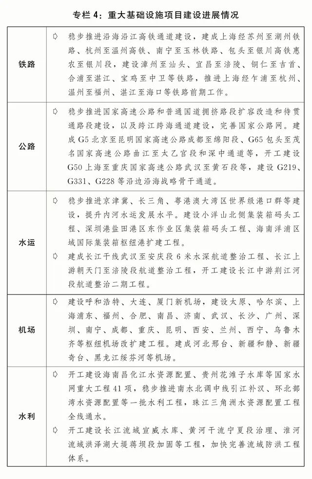 五是加快完善现代化基础设施体系。高质量推进川藏铁路等重大项目建设,加快构建国家水网工程体系,高水平共建西部陆海新通道。深入实施降低全社会物流成本专项行动。持续推进国家物流枢纽、国家骨干冷链物流基地、国家综合货运枢纽体系、大宗商品资源配置枢纽等布局建设。加快完善应急物流体系。深入推进公路水路交通基础设施数字化转型升级。推动各种运输方式规则标准统一协同,加快多式联运“一单制、一箱制”应用。