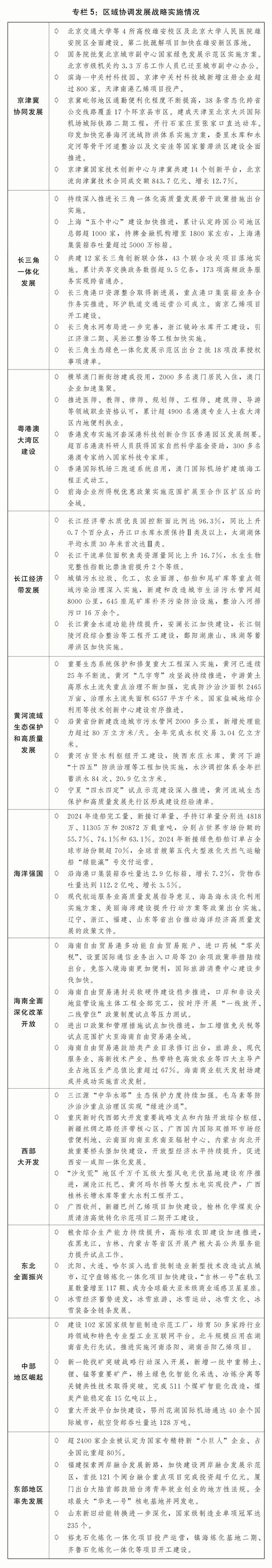 一是区域协调发展积厚成势。京津冀协同发展走深走实,在京相关高校、医院、中央企业总部及二三级子公司分批向雄安新区疏解,北京城市副中心行政办公、商务服务、文化旅游等功能不断完善,进一步支持天津滨海新区高质量发展若干政策措施出台实施,三省市互联互通交通网络更加完善、产业链上下游协作持续强化、公共服务共建共享水平进一步提升。长三角一体化高质量发展深入推进,生态绿色一体化发展示范区改革授权压茬推进,港口资源整合、轨道互联互通等取得新进展,上海“五个中心”建设进一步加快。粤港澳大湾区建设迈上新台阶,横琴粤澳深度合作区封关“一线”“二线”分线管理运行顺利,超1.6万名澳门居民在合作区居住生活,支持河套深港科技创新合作区深圳园区、香港园区联动发展,创新要素跨境流动更加便捷。长江经济带共抓大保护、不搞大开发成效显著,进一步抓实抓好长江大保护工作三年行动计划出台实施,长江十年禁渔取得明显成效,长江干流连续5年保持Ⅱ类水质,综合立体交通走廊加快构建,沿江高铁全线开工建设。黄河流域生态保护和高质量发展迈出坚实步伐,农业面源、城镇生活、工业和尾矿库污染治理深入推进,8万余个入河排污口开展溯源整治,一批生态保护修复重点项目加快建设,黄河干流连续3年保持Ⅱ类水质。海洋强国建设深入推进,海洋强省、现代海洋城市、全国海洋经济发展示范区创新发展,海洋生态环境质量持续改善,海洋生产总值超10万亿元。